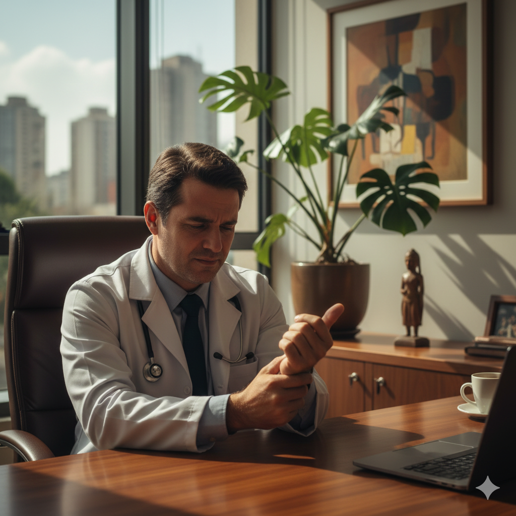 No meio de um procedimento ou performance, seu antebraço fica duro como pedra e quente. Você sente uma necessidade incontrolável de parar e chacoalhar a mão. Isso é isquemia local: seus músculos estão inchados e sem oxigênio, travando seus movimentos finos.